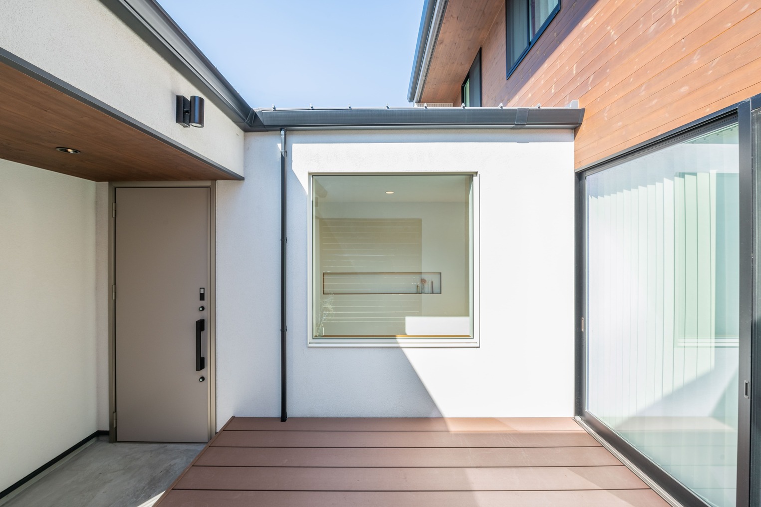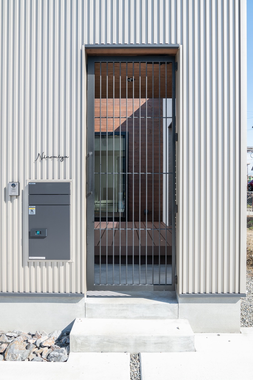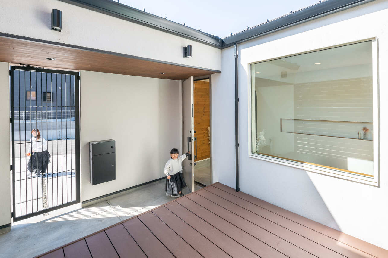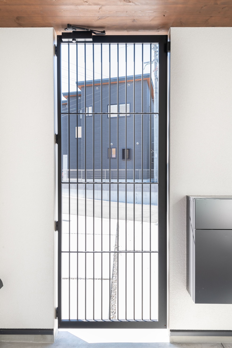「玄関アプローチ」と「中庭」を一体化させ、アイアン門扉を設けプライバシーを確保した空間に。