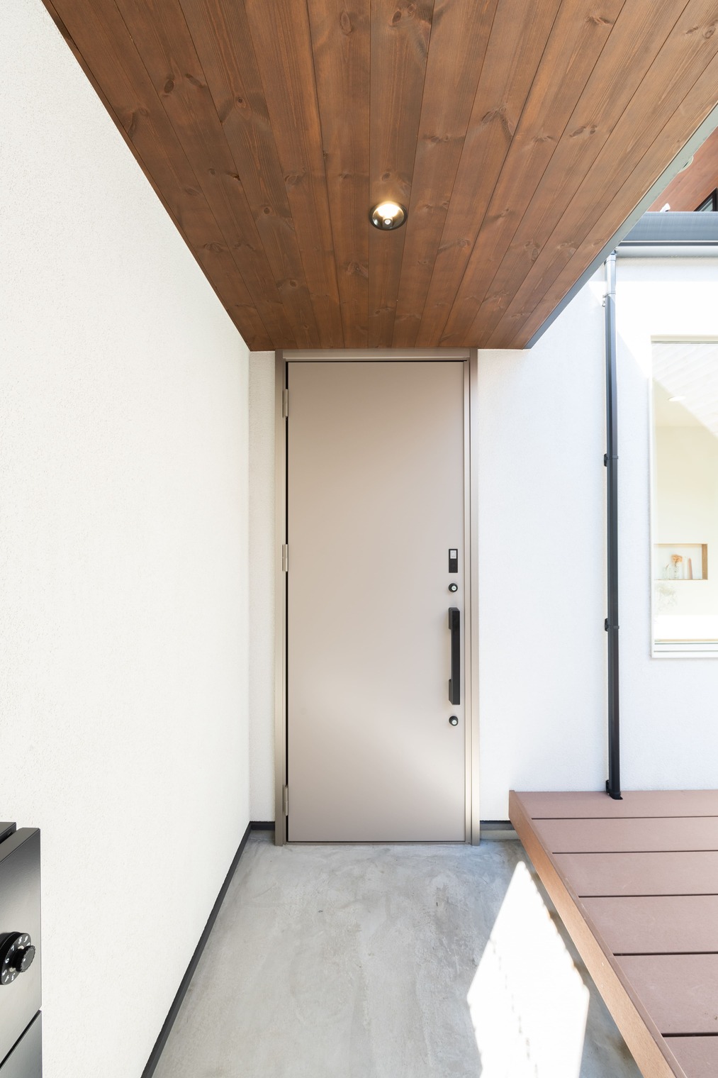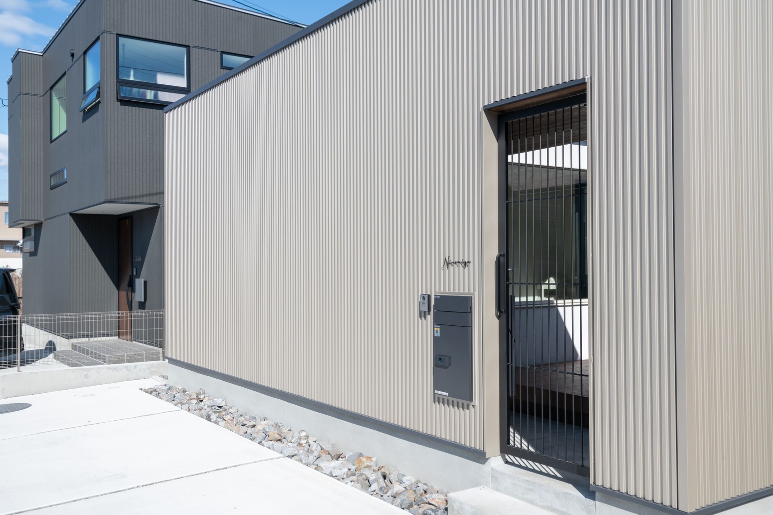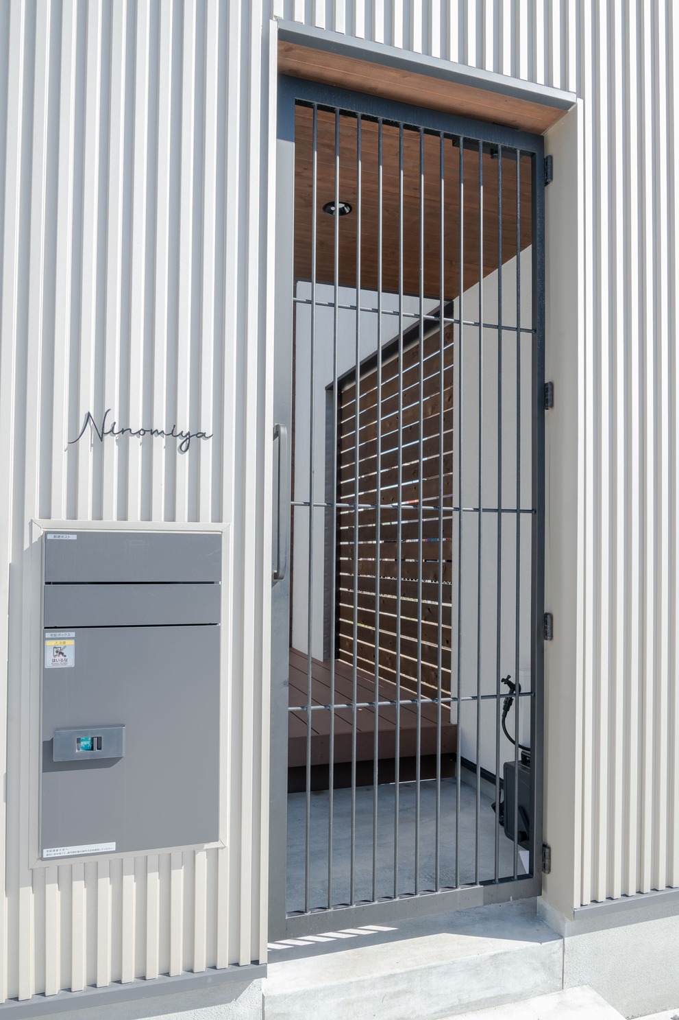 「玄関アプローチ」と「中庭」を一体化させ、アイアン門扉を設けプライバシーを確保した空間に。